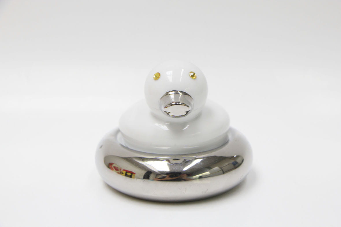 Porcelanowa figurka kaczki z brylancikowymi oczami, pod spodem zegarek i srebrzona podstawa, która jest jednocześnie schowkiem na małe skarby.