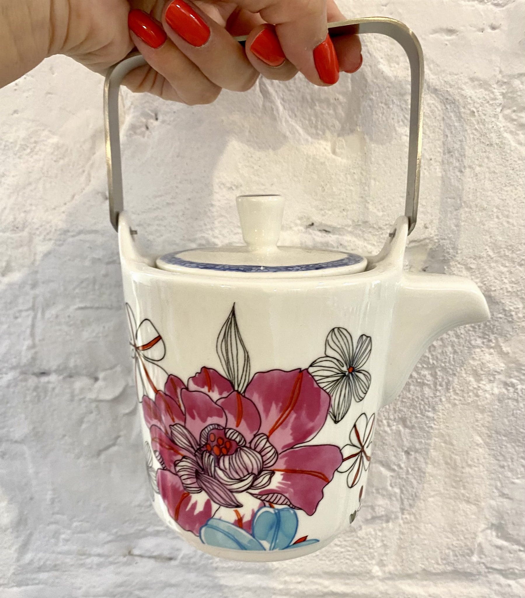 Klasyczny kształt nawiązujący do lat 50-tych przełamany kwiatowym nadrukiem, pokrywka z niebieskim szlaczkiem (inna niż na zdjęciu głównym, pokazana na kolejnych zdjęciach)
