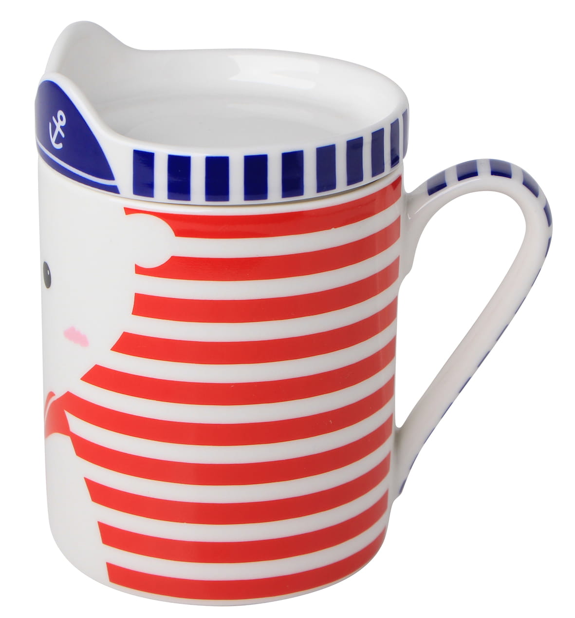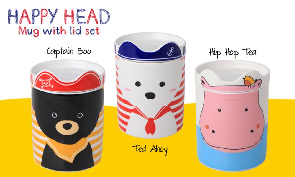 Zabawny wzór na kubku łączy się z pokrywką, która tworzy wystający "kapelusz"