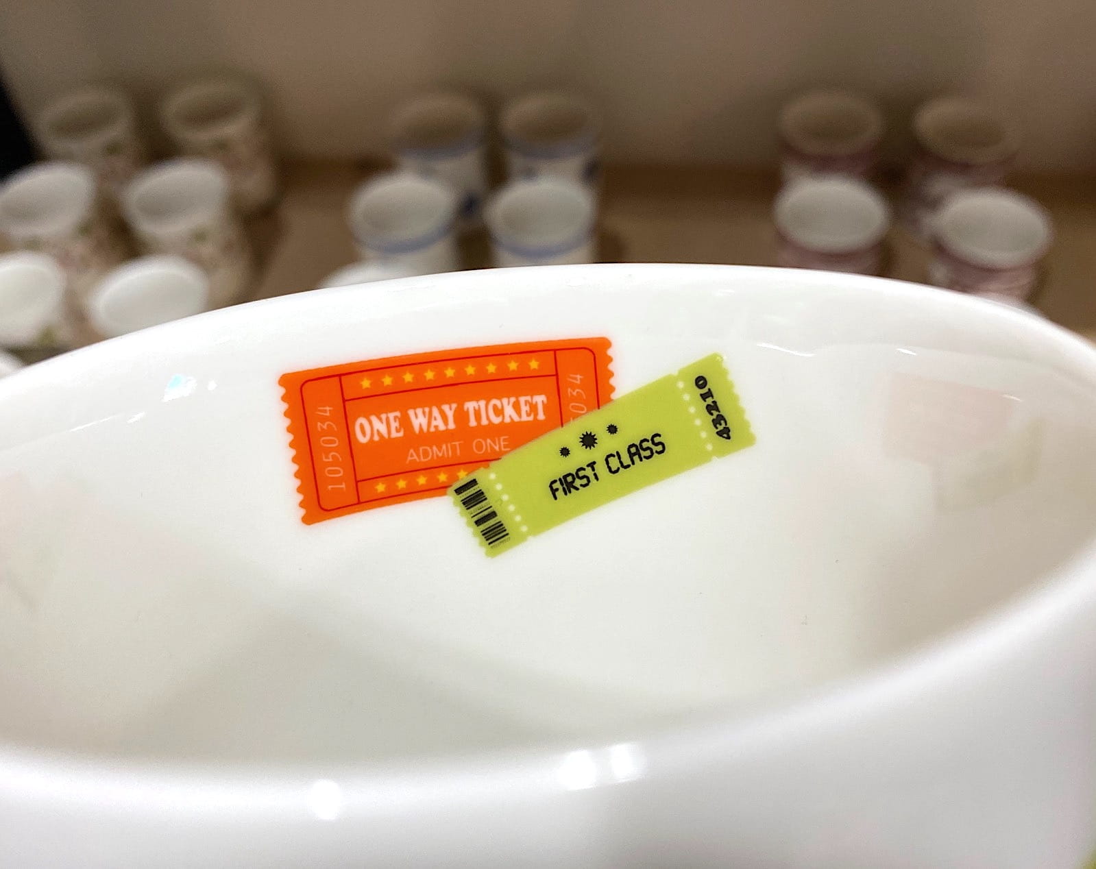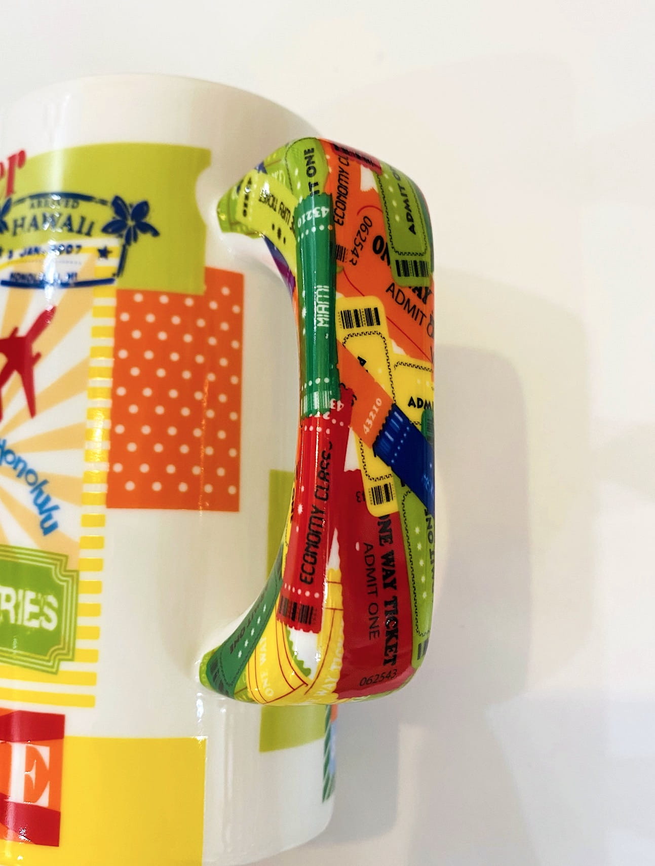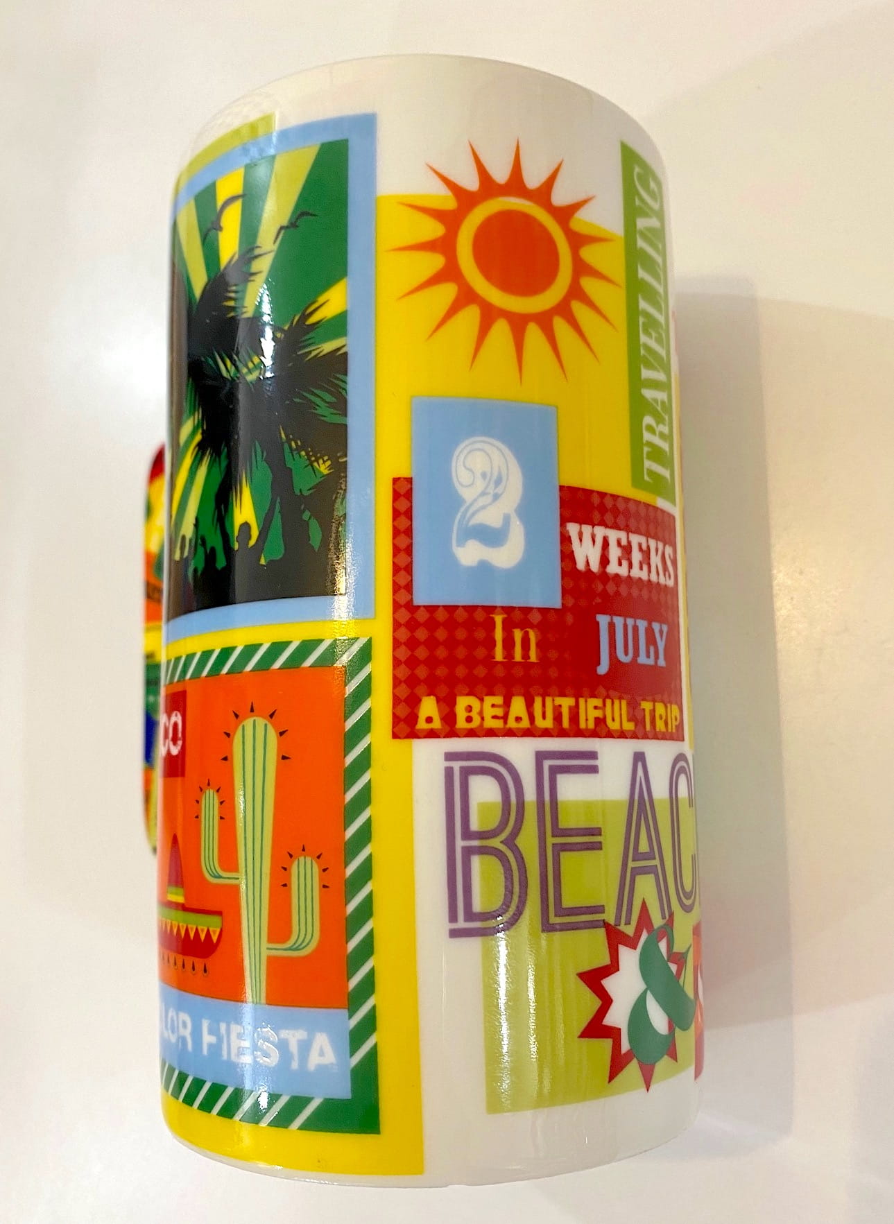 Niezwykły kubek z porcelany z oryginalnym, kolorowym wzorem - naklejkami podróżnymi