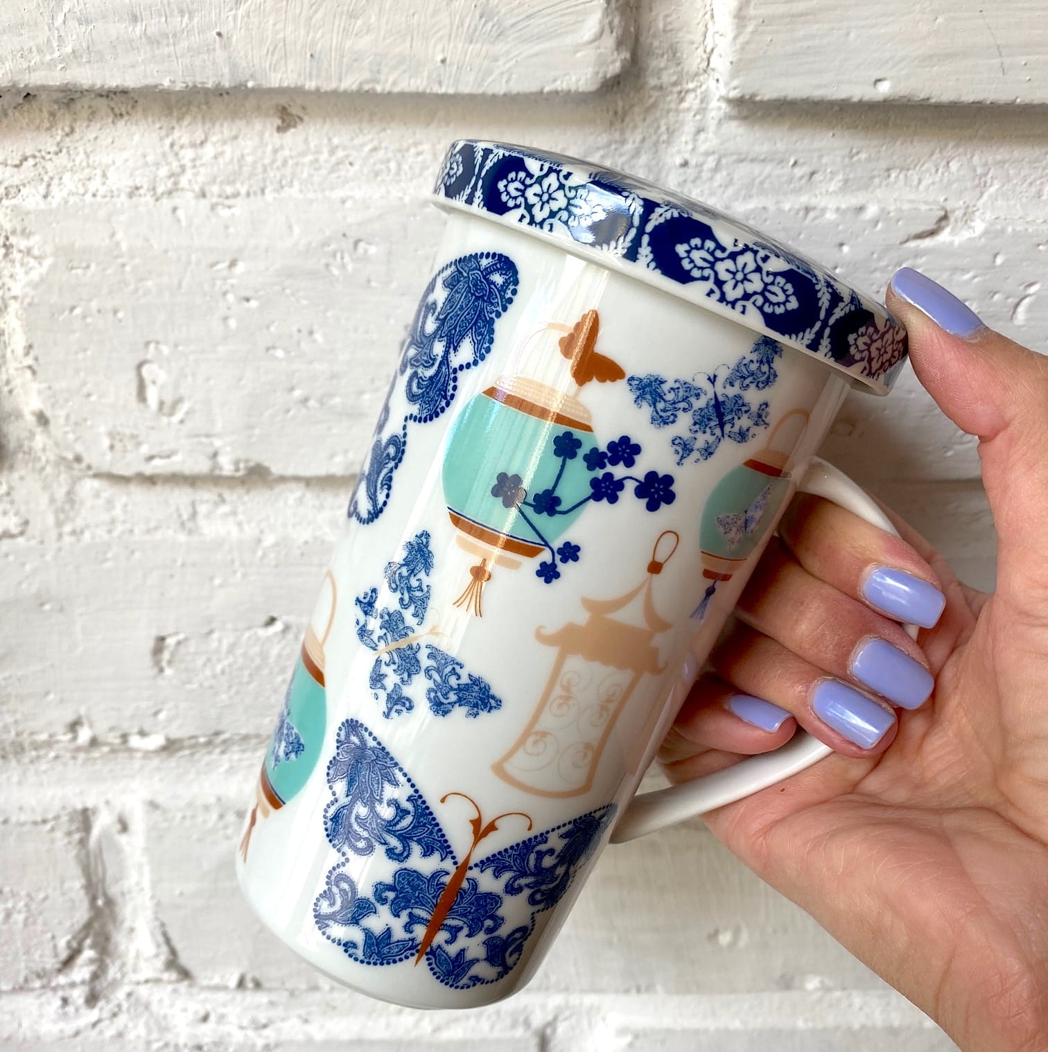 Duży porcelanowy kubek z zaparzaczem i przykrywką, motyw z motylami.
