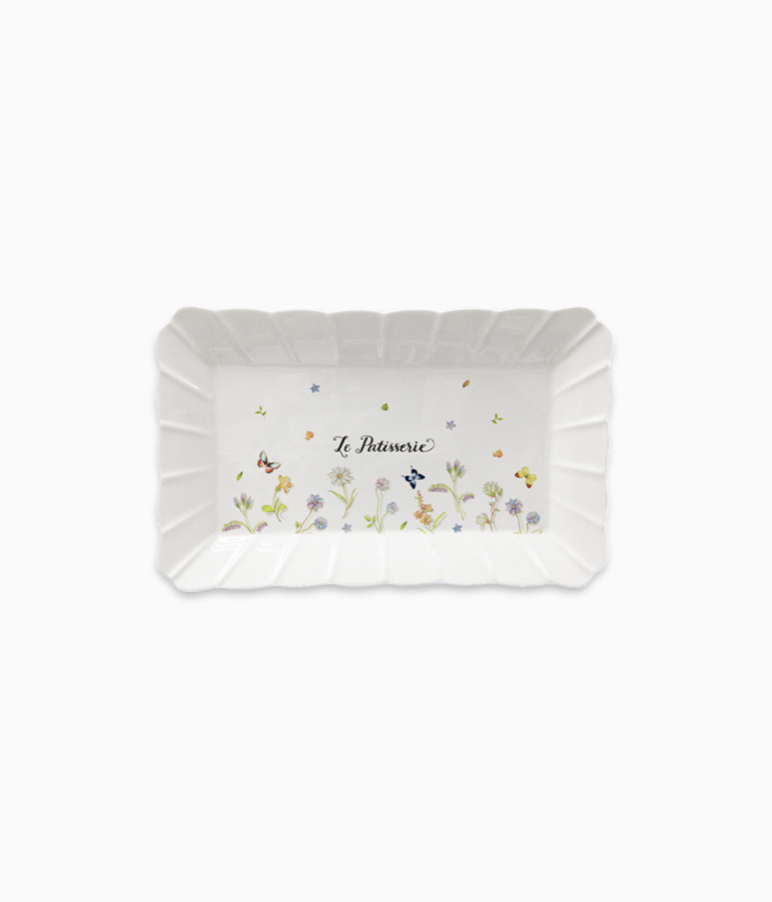 Przepiękna patera - duży prostokątny talerz na ciasta z kremowej porcelany ozdobiona motywem kwiatów i motyli.
