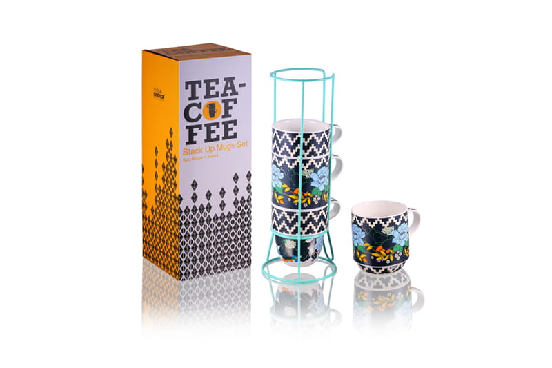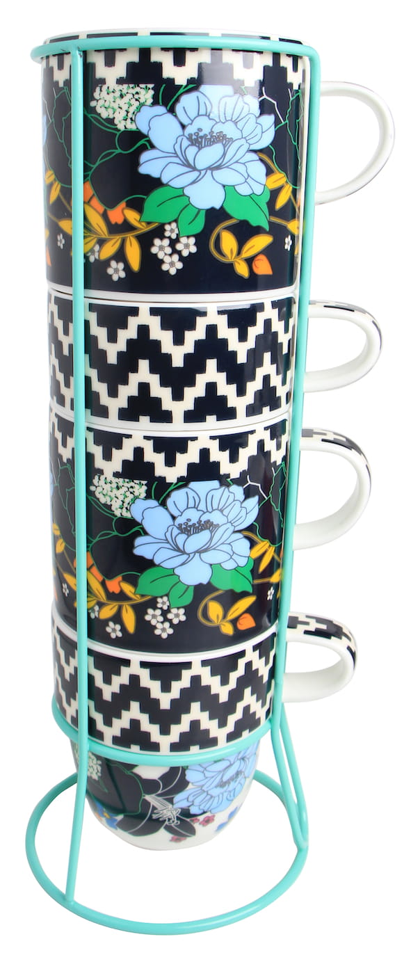 Kubki wchodzą jeden w drugi tworząc na stojaku wieżę, nadruki kubków układają się w piękny wzór.