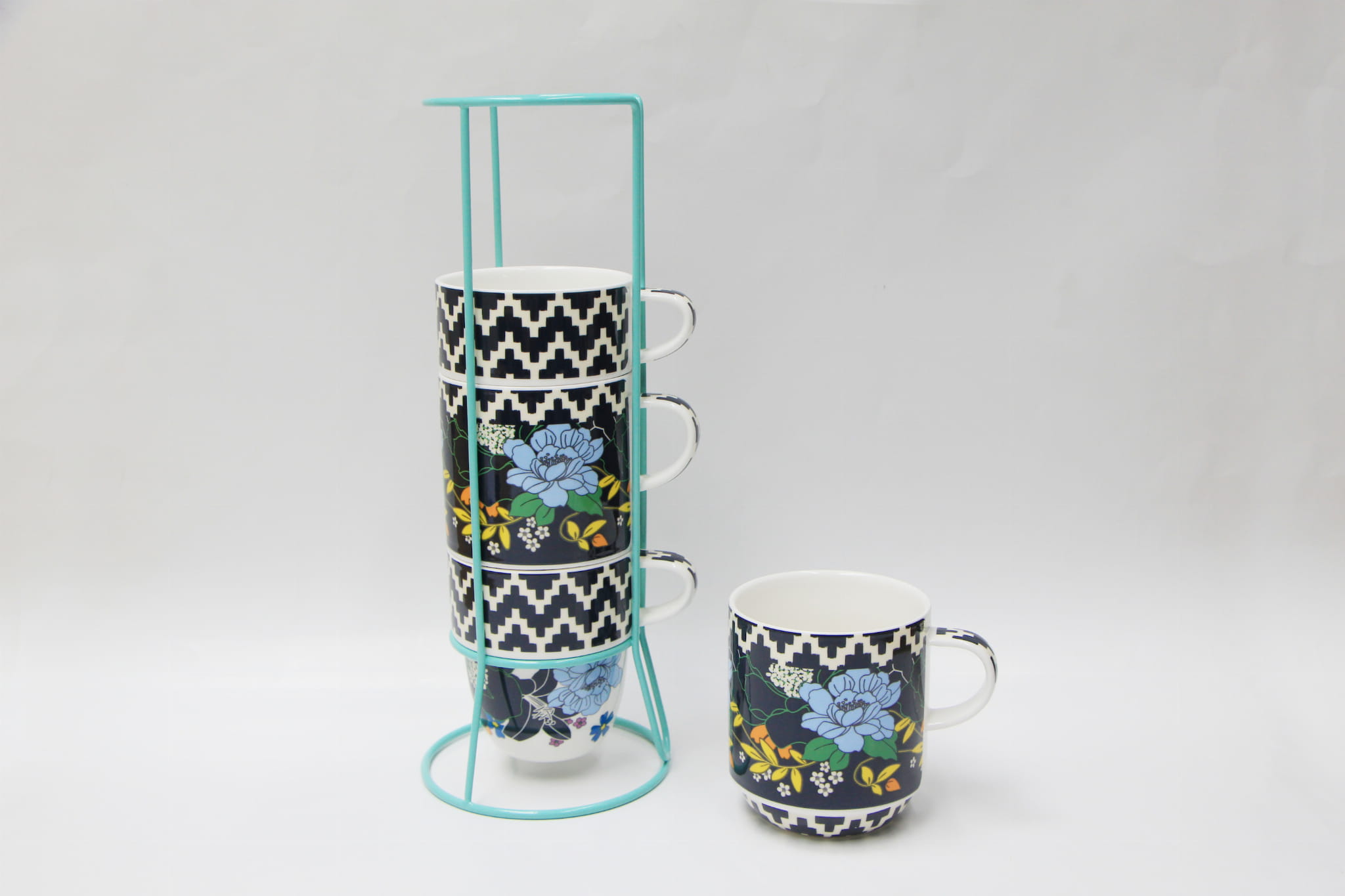 Zestaw 4 dużych porcelanowych kubków na stojaku