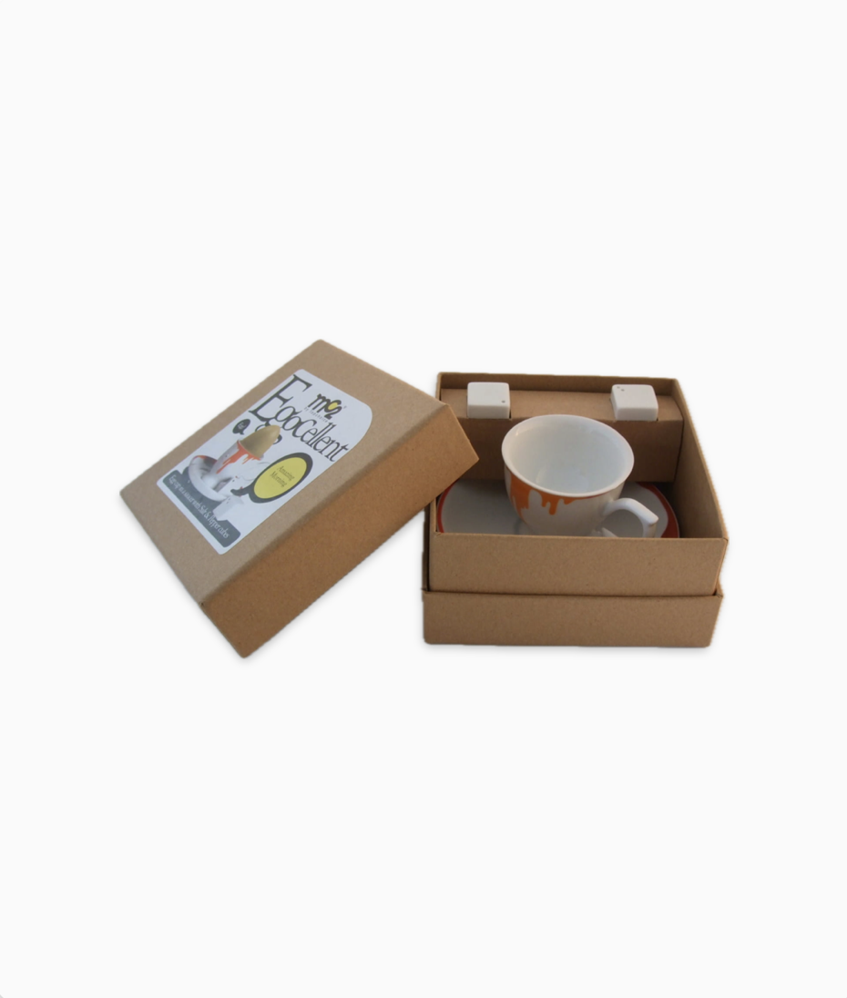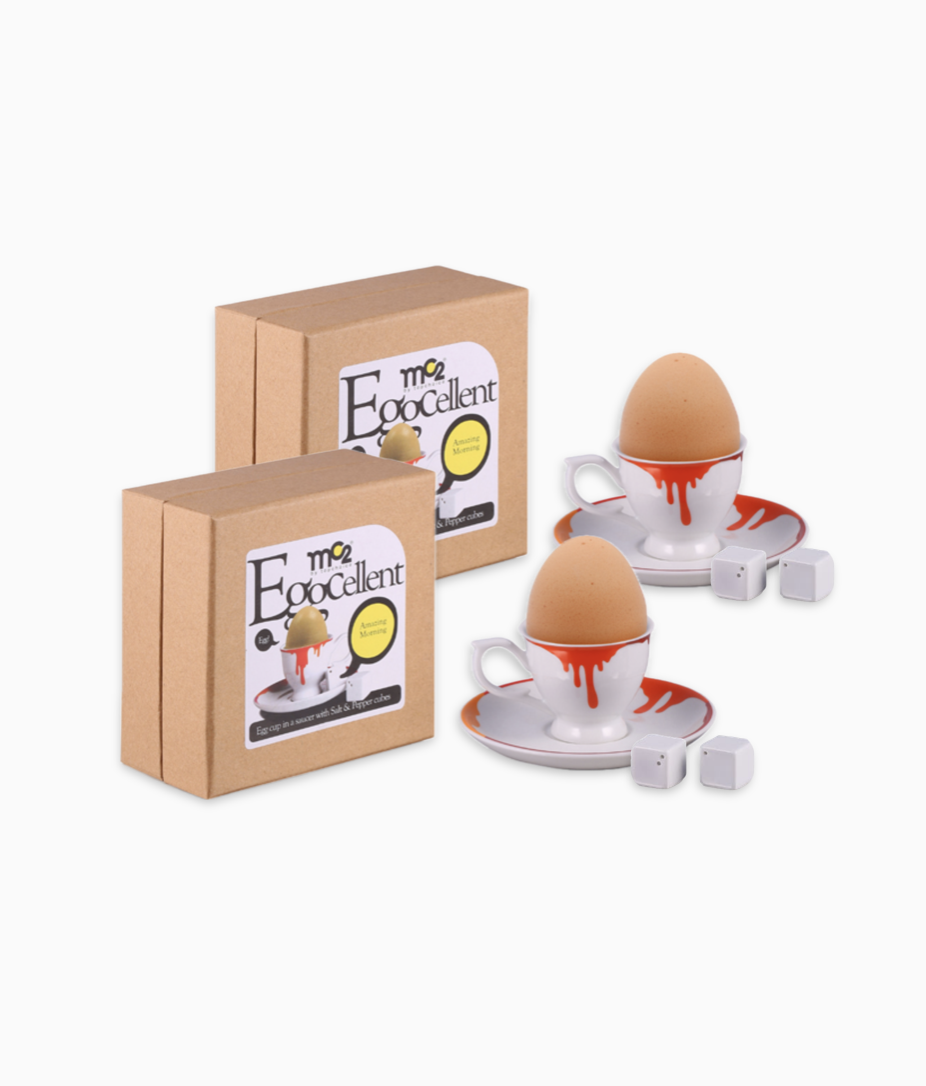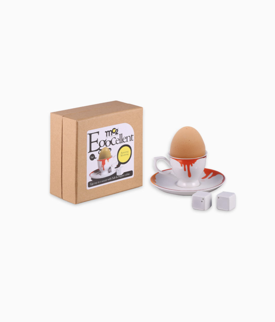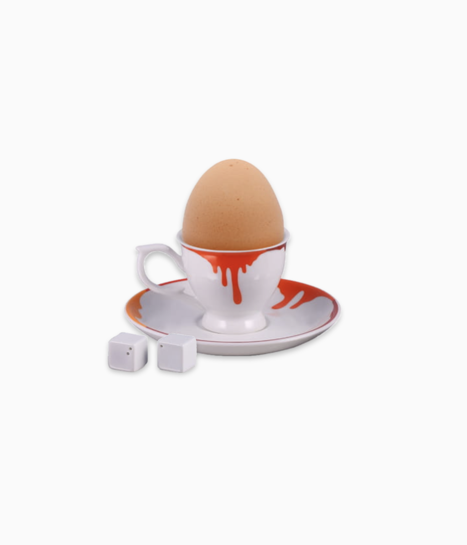 Zaskakujące podstawki do jajek w kształcie filiżanki do espresso, w komplecie z solniczką i pieprzniczką w kształcie kostek do gry.