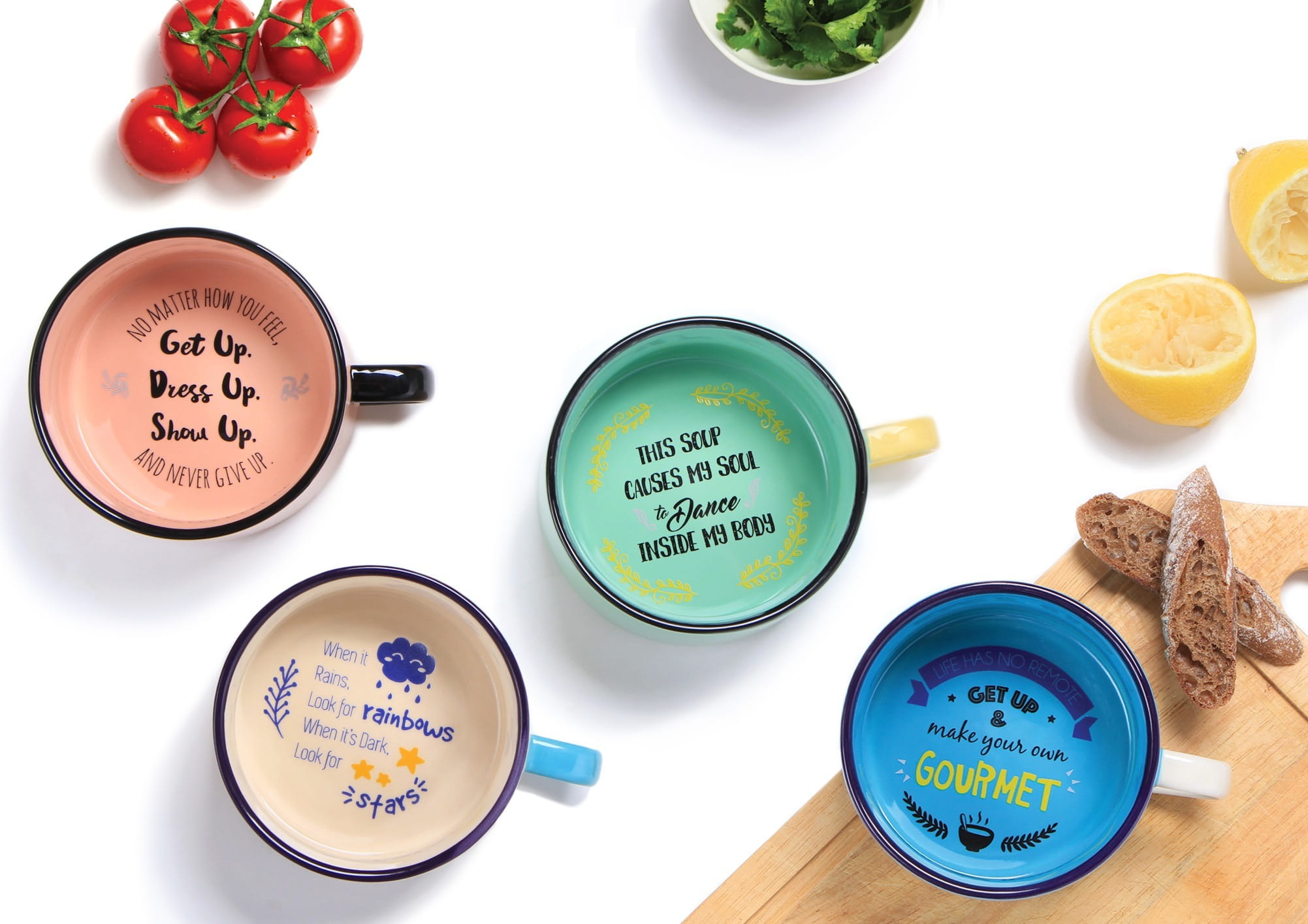 Idealnie wyprofilowany garnuszek z kamionki "Never Give up" z motywacyjnymi napisami