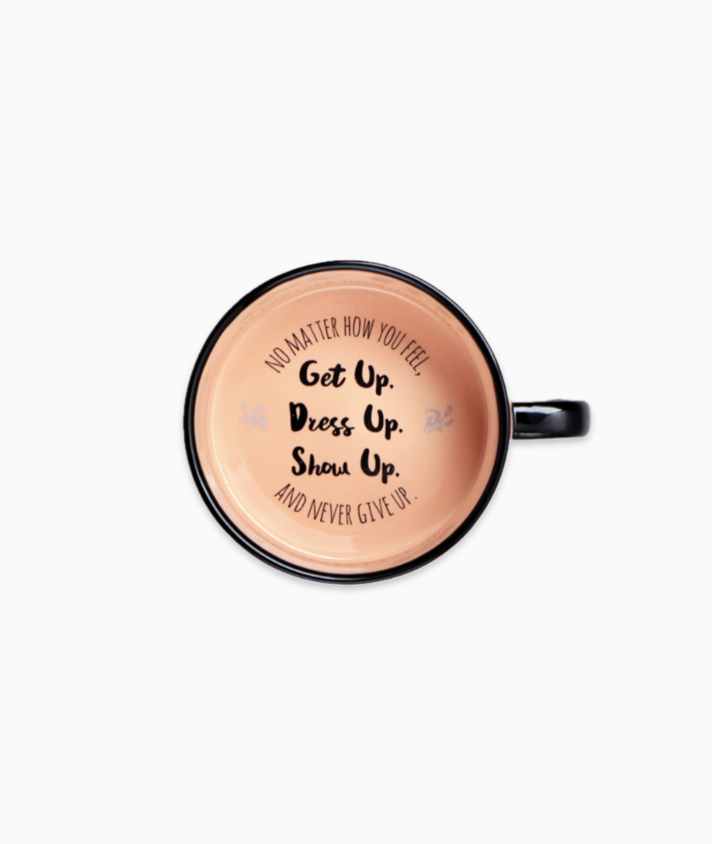 - Z przepięknym napisem i rysunkami na dnie - "Get Up, Dress Up, Show Up, Never Give up"